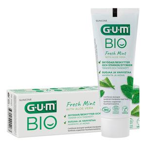 Denne Gum BIO tannkremen er perfekt for de som foretrekker en naturlig og organisk tannkrem. Tannkremen er laget med 99% naturlige ingredienser, i tillegg til 22% organiske ingredienser. Den er skånsom mot tannkjøttet så vel som tennene, og inneholder fluor, som anbefalt av danske tannleger for å styrke og beskytte emaljen mot karies. BIO-tannkremen er laget med økologisk aloe vera og økologisk peppermynte, som gir en forfriskende følelse. Tannkremen kommer i emballasje av 100% resirkulerbar papp, laget av 80% resirkulert papir.