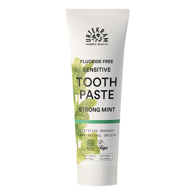 Strong Mint fluorfri tannkrem fra Urtekram med nærende aloe vera-ekstrakt, myrraolje, lakris og lekker, sterk mynte