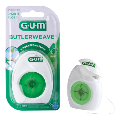 GUM Butlerweave Floss Mint er en flat, vokset tanntråd med mintsmak som gir en grundig rengjøring mellom tennene. Tanntråden er unikt vevd, noe som gjør den effektiv til å fjerne plakk og matrester, selv under tannkjøttranden. Den glir lett mellom tennene uten å frynse seg, og er behagelig å bruke takket være den friske mintsmaken.