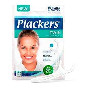 Bruk Plackers Twin Double Effect Flossers daglig for å fjerne plakk og matrester mellom tennene.