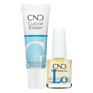 CND Nail & Cuticle Couple Kit inneholder også CND Cuticle Eraser, en skånsom AHA-behandling som eksfolierer og mykgjør neglebåndene. Kombinasjonen av de to produktene reduserer synlige neglerøtter og etterlater hendene med et mer ensartet og velstelt utseende. Settet er egnet for daglig pleie.