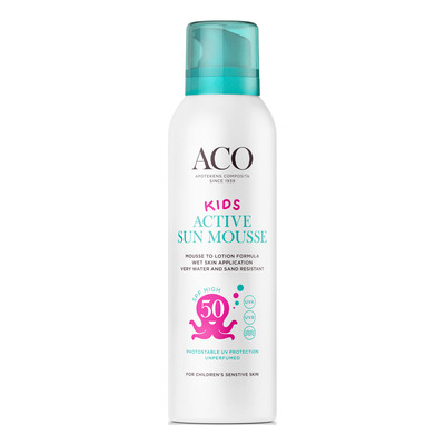 ACO Sun Kids Mousse SPF 50 er en solmousse med høy beskyttelse som er spesielt utviklet for barns sensitive hud. Den lette mousseformelen er enkel å påføre og fordele jevnt, absorberes raskt og etterlater ingen fet følelse. Produktet kan påføres selv på våt hud og er svært vann- og sandbestandig.
