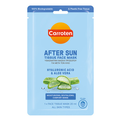 Carroten After Sun Mask er en uunnværlig vevsmaske med aloe vera og hyaluronsyre som umiddelbart beroliger og gir fuktighet til soleksponert hud. Masken gjenoppretter tapt fuktighet og opprettholder hudens glød, reduserer flassing og beroliger rød hud. Carroten After Sun Mask har en ultraberoligende formel som bidrar til å gjenopprette hudens integritet etter opphold i solen, og den rike sammensetningen av antioksidanter sørger for optimal hudpleie.
