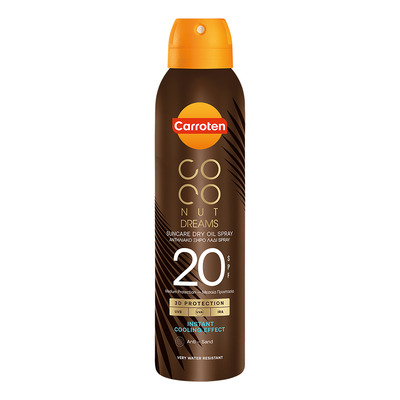 Carroten Dry Oil SPF20 Coconut Dreams er en sololje med solfaktor 20. Sololjen leveres med et spraysystem som gjør den rask og enkel å påføre over hele kroppen. Tørroljen er formulert med gulrot- og kokosnøttolje, som bidrar til å forsterke fargeprosessen for en brun og strålende hudfarge samtidig som den beskytter huden mot solen. Den er ikke fet og smører seg lett på huden. Sololjen inneholder naturlige ekstrakter fra blant annet gulrot, alkanarot og ringblomst, samt vitamin C og E som bekjemper frie radikaler og oksidativt stress forårsaket av solen.