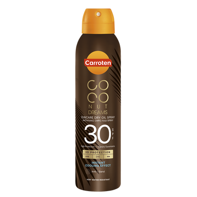 Carroten Dry Oil SPF30 Coconut Dreams er en sololje med solfaktor 30. Sololjen leveres med et spraysystem som gjør den rask og enkel å påføre over hele kroppen. Tørroljen er formulert med gulrot- og kokosnøttolje, som bidrar til å forsterke fargeprosessen for en brun og strålende hudfarge samtidig som den beskytter huden mot solen. Den er ikke fet og smører seg lett på huden. Sololjen inneholder naturlige ekstrakter fra blant annet gulrot, alkanarot og ringblomst, samt vitamin C og E som bekjemper frie radikaler og oksidativt stress forårsaket av solen.