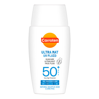 Carroten Ultra Mat Face Fluid SPF 50+ er en avansert ansiktsvæske med LightGuard-teknologi som absorberes raskt inn i huden uten å virke fetende eller etterlate hvite merker. Formelen gir effektiv 4D-beskyttelse mot UVB-, UVA-, VL- og IRA-stråler og er beriket med naturlig salisylsyre som bidrar til å redusere urenheter og holde porene rene.