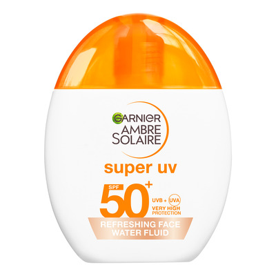 Garnier Ambre Solaire Super UV Refreshing Water Fluid SPF50+ er en lett solkrem for ansiktet og øyeområdet. Den er beriket med hyaluronsyre, silika og perlit som gir fuktighet, absorberer overflødig olje og etterlater huden frisk og matt. Den lett fargede formelen gir huden en naturlig glød og et jevnt utseende. Konsistensen er ultralett og føles ikke klissete på huden. Den er også parfymefri.