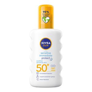 Nivea Sun Sensitive Protect Soothing Spray SPF 50+ er en solkrem for kroppen som gir ekstra høy beskyttelse mot solens stråler. Denne solkremen fra Nivea gir deg beskyttelse mot både UVA- og UVB-stråler, beskytter huden mot solbrenthet og reduserer risikoen for solallergi. Solkremen er spesielt god for sensitiv hud og er parfymefri og vannfast.
