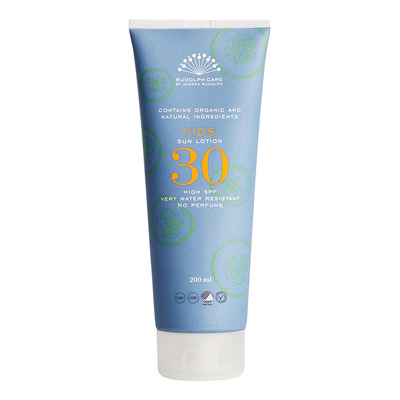 Rudolph Care Sun Kids Lotion SPF30 er en vannavvisende sollotion som beskytter barnets hud mot solens skadelige UVA- og UVB-stråler. Kids Sun Lotion er lett å påføre og verken klistrer, fetter eller etterlater hvite striper. Solkremen er beriket med naturlige, pleiende ingredienser som agurkekstrakt, som fukter og kjøler huden, kamille, som virker beroligende, og rapsolje, som gir næring og holder på fuktigheten i huden.