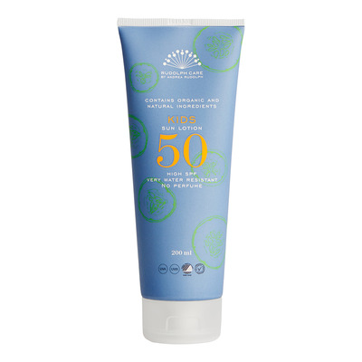 Rudolph Care Sun Kids Lotion SPF50 er en vannavvisende sollotion som beskytter barnets hud mot solens skadelige UVA- og UVB-stråler. Kids Sun Lotion er lett å påføre og verken klistrer, fetter eller etterlater hvite striper. Solkremen er beriket med naturlige, pleiende ingredienser som agurkekstrakt, som fukter og kjøler huden, kamille, som virker beroligende, og rapsolje, som gir næring og holder på fuktigheten i huden.