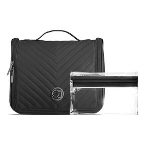 Toalettveske fra Gillian Jones med smart opphengsfunksjon i en flott, sort farge og med sølvemblem