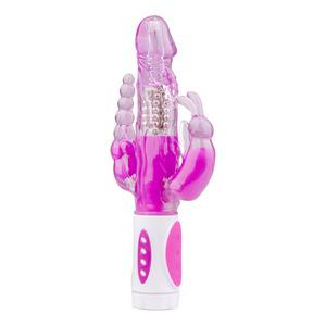 EasyToys Triple Rabbit Vibrator gir ultimat stimulering av klitoris, g-punktet og anus samtidig. Vibratoren har et realistisk formet skaft som gir innvendig massasje, mens det roterende hodet stimulerer g-punktet. Den har også små "kaninører" som stimulerer klitoris når du bruker den. Analstimulatoren er laget av et ekstra mykt og glatt materiale.