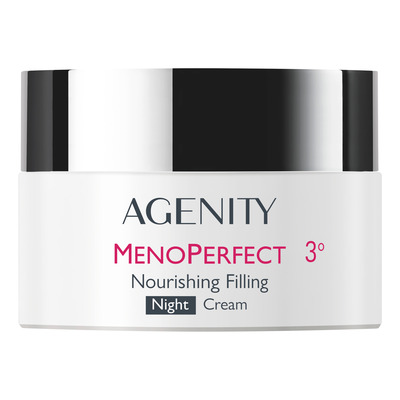 AGENITY MENOPERFECT 3° Night Cream er en nærende, oppstrammende og intensivt regenererende nattkrem for hud i overgangsalderen. Den kompenserer for hormonelt tap av fasthet og fylde, styrker hudens struktur og reduserer rynker med sheasmør, squalane og kakaosmør.