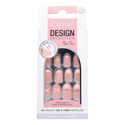 Depend Cosmetic Design Selection Pink Bow Oval er kunstige negler med oval form og dekorative sløyfer. Neglene har et feminint design i rosa farge som gir et velpleiet og stilrent utseende. Flexi-Thin-teknologien sikrer en tynn og fleksibel passform som følger den naturlige neglen. Settet inneholder 24 negler i forskjellige størrelser, slik at du enkelt kan finne den riktige passformen.