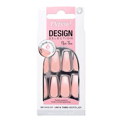 Depend Design Selection French Ombre Coffin er kunstnagler i en fleksibel kvalitet som gir perfekt passform. Designet er elegant og moderne med en lett avrundet kisteform. Neglene er enkle å påføre og sitter godt på dine egne negler. Du kan selv velge om du vil bruke det medfølgende limet eller flikene, da begge metodene er raske og holdbare. Pakken inneholder 24 negler, slik at du enkelt kan finne riktig størrelse til hver finger.