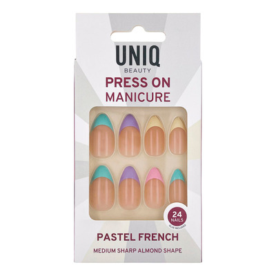 UNIQ Press-On Nails with Glue Pastel French er et komplett neglesett med 24 kunstige negler i medium mandelform. De myke pastellfargene gir en moderne tolkning av den klassiske franske manikyren. Settet er perfekt til både hverdag og fest og krever ingen UV-lampe for å oppnå et vakkert resultat hjemme.