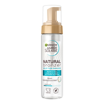 Ambre Solaire Natural Bronzer Self Tan Mousse fra Garnier er en transparent selvbruningsmousse som kan brukes i både ansikt og kropp. Selvbruningen er enkel å påføre og trenger raskt inn i huden, og viser resultater på kun 1 time. Du vil raskt oppnå en naturlig, solkysset glød som varer i opptil en uke. Formelen er beriket med kokosekstrakt som gir mye fuktighet til huden, og moussen har også en herlig og sommerlig duft av kokos.