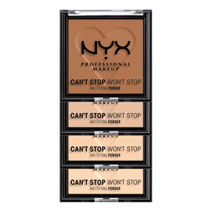 NYX Professional Makeup Can't Stop Won't Stop Mattifying Powder er et lett og kompakt pudder som gir en vakker matt finish og bidrar til å holde glansen borte hele dagen. Pudderet har en silkemyk formel som gjør porene mindre synlige og jevner ut hudteksturen, slik at huden etterlates feilfri og glatt. Pudderet er perfekt for fet eller kombinert hud, og det er enkelt å ta med seg på farten for raske touch-ups. Finnes i flere nyanser for å matche ulike hudtoner.