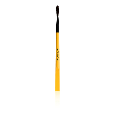 WOWBROW Brow Styling Brush er en profesjonell brynbørste med to ender: en spatelformet side for påføring av voks og gel, og en smal børste for presis forming og definisjon av hver enkelt brynlinje.