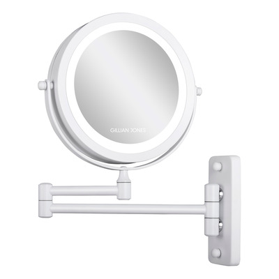 Gillian Jones dobbeltsidig LED-veggspeil med x10-forstørrelse er et veggspeil med ekte speilglass og en sammenleggbar arm med en rekkevidde på 31,5 cm. Den ene siden av speilhodet viser 1:1 for naturlig visning, mens den andre gir x10-forstørrelse for presis sminke og grooming. Speilhodet har en diameter på 17,5 cm og kan roteres 360°.