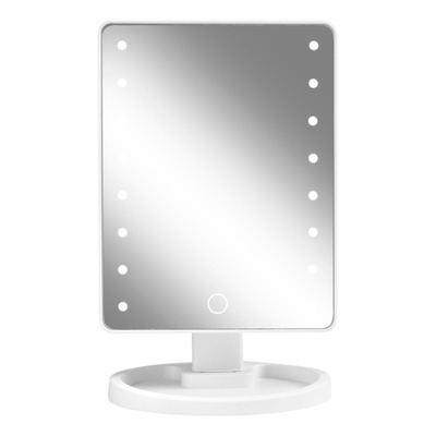Plasser speilet på et stabilt underlag. Koble til USB-C-kabelen eller sett inn 4 x AA-batterier. Slå på LED-lyset og juster lysstyrken med berøringsknappen. Vipp speilet til ønsket vinkel, og bruk skuffen til oppbevaring av småting.