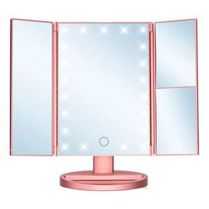 UNIQ Hollywood sminkespeil i roségull er et funksjonelt speil med 21 LED-lys langs kanten som gir et jevnt lys når du sminker deg. Speilet kan vippes for å finne den rette vinkelen, og det midterste speilet suppleres av to sidespeil med 2x og 3x forstørrelse. Dette gjør det lettere å se små detaljer når du sminker deg eller legger bryn.