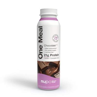Nupo One Meal +Ready to Drink Shake Chocolate er en ferdigblandet måltidserstatter med en intens sjokoladesmak. Den inneholder alle nødvendige næringsstoffer i ett måltid og er ideell når du trenger en rask og enkel løsning. Shaken er kalorifattig og kan brukes til vekttap eller vektkontroll. Den er klar til bruk rett fra flasken og krever ingen tilberedning, noe som gjør den ideell for travle livsstiler.
