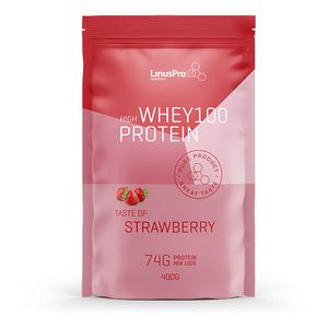 LinusPro Whey100 Strawberry med 76 % myseproteinkonsentrat av høyeste renhet.