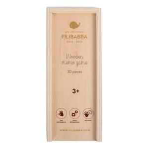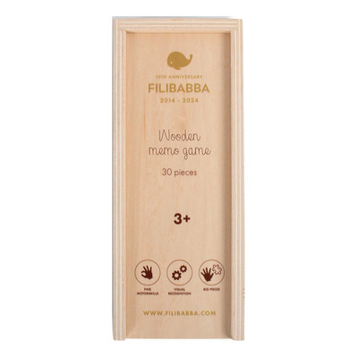 Filibabba Anniversary Collection Wooden Reversible Game markerer et tiår med lek og læring med en eksklusiv kolleksjon i begrenset opplag. Dette vendbare spillet er en feiring for barn med sine 30 vakkert utformede trebrikker med de mest elskede Filibabba-designene. Spillet er også en hyllest til felles lek og utvikling. Spillet utfordrer og styrker barnas hukommelse, gjenkjennelse og konsentrasjonsevne i en morsom og interaktiv kontekst.