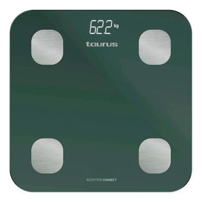 TAURUS Smart Inception Connect badevekt viser ikke bare vekten din, men måler også opptil 11 kroppsmål, inkludert kroppsfettprosent, muskelmasseprosent, benmasseprosent, vannprosent, BMI, metabolisme, bukfettindeks, total muskelmasse, kroppstype og kroppsalder via Bluetooth-tilkobling til Taurus Connect-appen. Vekten registrerer data for opptil 14 brukere.
