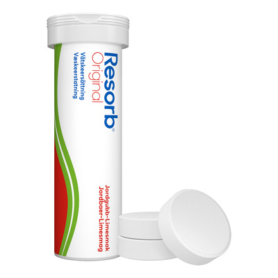 Nestlé Resorb Original Strawberry-Lime er brusetabletter som støtter væske- og saltbalansen i kroppen. Brusetablettene inneholder en kombinasjon av karbohydrater og elektrolytter som bidrar til å gjenopprette væskebalansen ved væsketap. Hver pakke inneholder to tuber med 10 brusetabletter i hver, og smaken er frisk jordbær-lime. Resorb Original er egnet for voksne og barn over tre år som trenger effektiv væskeerstatning. Tabletten løses lett opp i vann og er praktisk å bruke både hjemme og på farten.