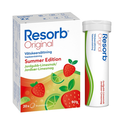 Resorb Original Strawberry-Lime er brusetabletter som bidrar til å gjenopprette kroppens væskebalanse. Produktet inneholder elektrolytter som natrium og kalium som støtter væskeopptaket i kroppen. Det er egnet ved dehydrering i forbindelse med idrett, varme dager eller sykdom. Smaken av jordbær og lime gjør det enkelt å innta, og tablettene løses lett opp i vann.