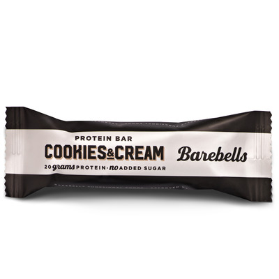 Barebells Cookies & Cream er en kremet og mettende proteinbar med 20 g protein, inspirert av den klassiske dessertkombinasjonen av kakaokjeks og fløte. Baren har en myk tekstur med knasende kakaonibs og er overtrukket med melkesjokolade - uten tilsatt sukker.
