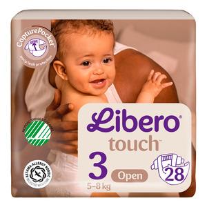 Libero Touch 3 Open Nappy 5-8 kg er laget av supermyke, pustende materialer for maksimal komfort. Den elastiske passformen rundt mage, rygg og ben sørger for at bleien følger barnets bevegelser uten å være i veien. Soft Seals rundt lårene forhindrer lekkasjer og gir en behagelig tetthet. Bleien er designet med tanke på både babyen og miljøet, og er produsert med strøm fra fornybare energikilder. Emballasjen inneholder 60 % resirkulerbar plast, og produktet er FSC®-sertifisert.