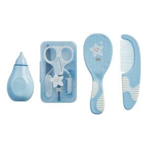 SARO BABY BABY Toiletries i blått er det perfekte pleiesettet for de minste. Settet inneholder fire viktige artikler: en myk hårbørste, en kam, en nesesuger og en negleklipper. Alle artiklene er designet for å være enkle å bruke og trygge for barnet. Hårbørsten og kammen har sklisikre gummihåndtak slik at de er lette å holde i, selv når hendene er våte.