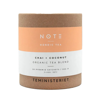 Teministeriet Note Chai Coconut er sertifisert økologisk (DK-ØKO-100) og laget av naturlige ingredienser. Den bør oppbevares på et tørt og mørkt sted. En elegant te til hverdag og fest som både varmer og forfrisker med sine krydrede og tropiske toner.